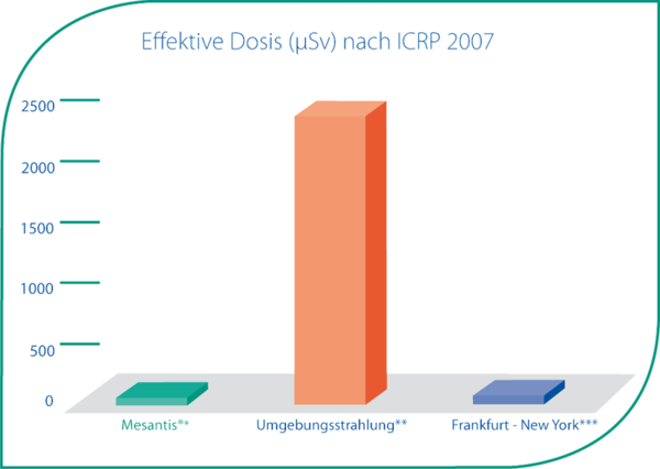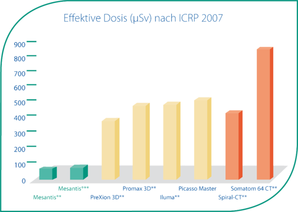 Die Strahlenbelastung zwischen hochauflösenden DVT-Scannern verschiedener Hersteller und modernen Computertomographen (Spiral-CT, Somatom 64) variiert erheblich. Während die DVT-Geräte PreXion 3D, Promax 3D und ILUMA ähnliche effektive Dosen aufweisen wie CTs, sind nach den Erkenntnissen neuester wissenschaftlicher Studien die effektiven Dosen bei den von MESANTIS verwendeten Geräten signifikant geringer.