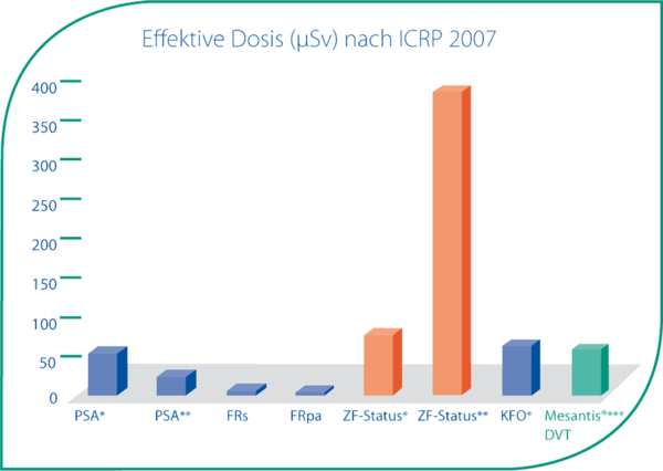 Der direkte Vergleich von konventionellen Röntgenaufnahmen wie PSA (Panoramaschichtaufnahme) und Zahnfilmen zeigt, dass ein DVT etwas über den Werten einer PSA liegt. Dafür beinhaltet die DVT aber ein Vielfaches an Mehrinformationen. Im Vergleich zu einem Zahnfilmstatus weist die DVT sogar deutlich weniger Strahlenbelastung auf. Die üblicherweise in der Kieferorthopädie (KFO) angefertigten Bilder entsprechen der Strahlenbelastung eines DVT.
